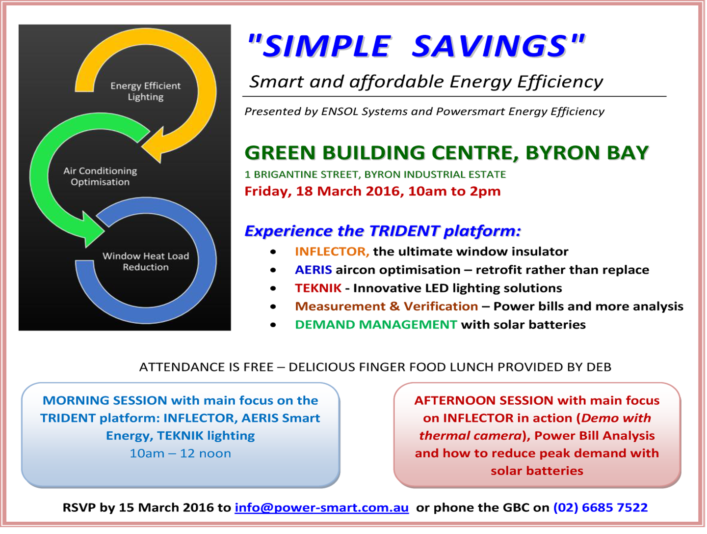 FREE workshop “Simple Savings” by Michael | Mar 11, 2016 | LATEST NEWS, Uncategorized | 0 comments Learn about simple and cost effective ways to reduce your carbon footprint and save on your energy costs…. 18 March 2016, Green Building Centre Byron Bay, 1 Brigantine Street. Submit a Comment Cancel replyYour email address will not be published. Required fields are marked *Comment * Name * Email * Website Save my name, email, and website in this browser for the next time I comment. Δ